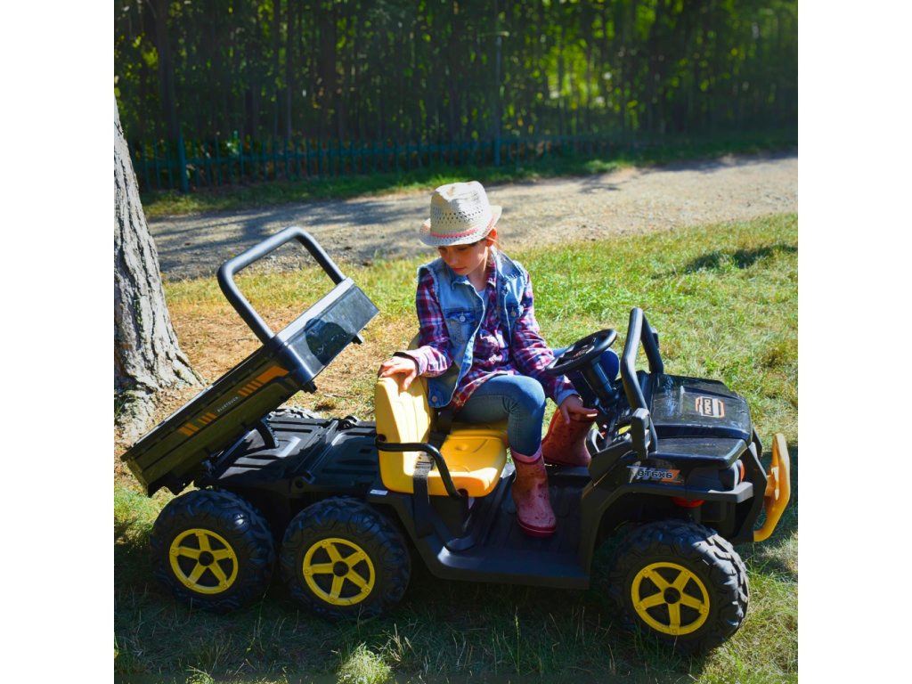 S výkonem 300 W a čtyřmi výkonnými motory (4 x 75 W) zvládne i náročnější terén. Malý řidič může volit, zda budou aktivně zabírat 2 či 4 kola. Díky velkým EVA kolům (33” s šířkou 13 cm) a odpružení poskytuje pohodlnou a stabilní jízdu. Maximální rychlost až 8 km/h a tři rychlostní stupně umožní malým dobrodruhům přizpůsobit tempo dle potřeby.